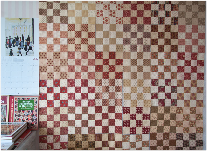 Toch lijkt een scrapquilt opbouwen eenvoudiger dan het is. Bij geen enkele andere quilt moet je zo dikwijls schikken, herschikken en alles van op een afstand bekijken. Terwijl ik zo bezig ben dwalen mijn ogen af naar de kalender van L.S.Lowry, waarover ik in dag 638 al schreef, die naast mijn design wall hangt. Zijn het de kleuren die Lowry gebruikt die ik nog mis in mijn quilt? |